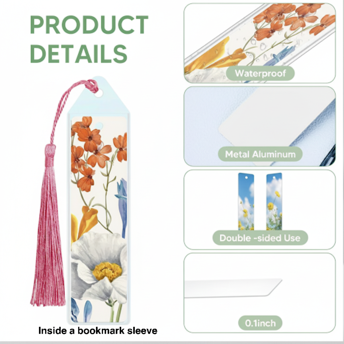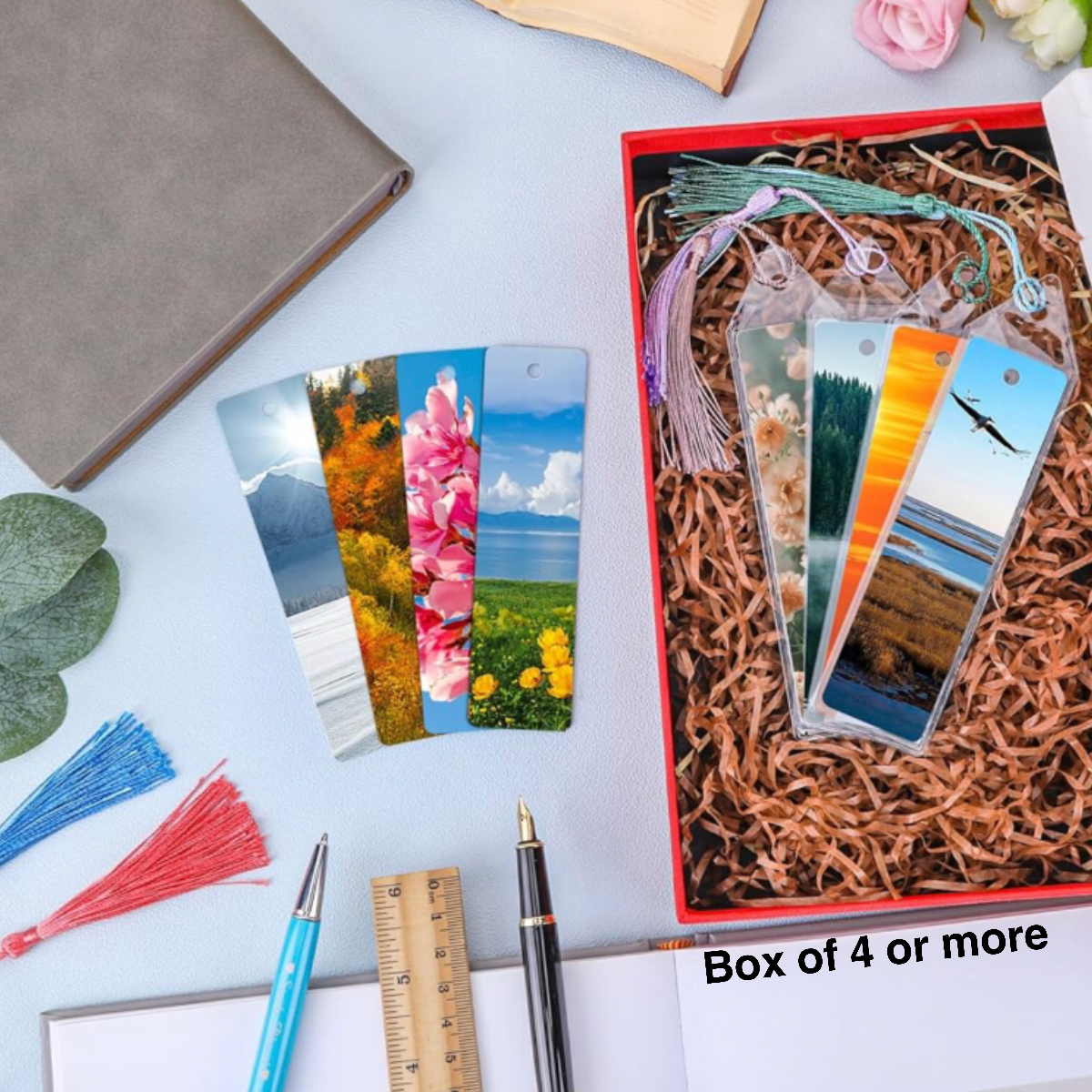 Package contains: double sided printed bookmark and 1 random color tassel.